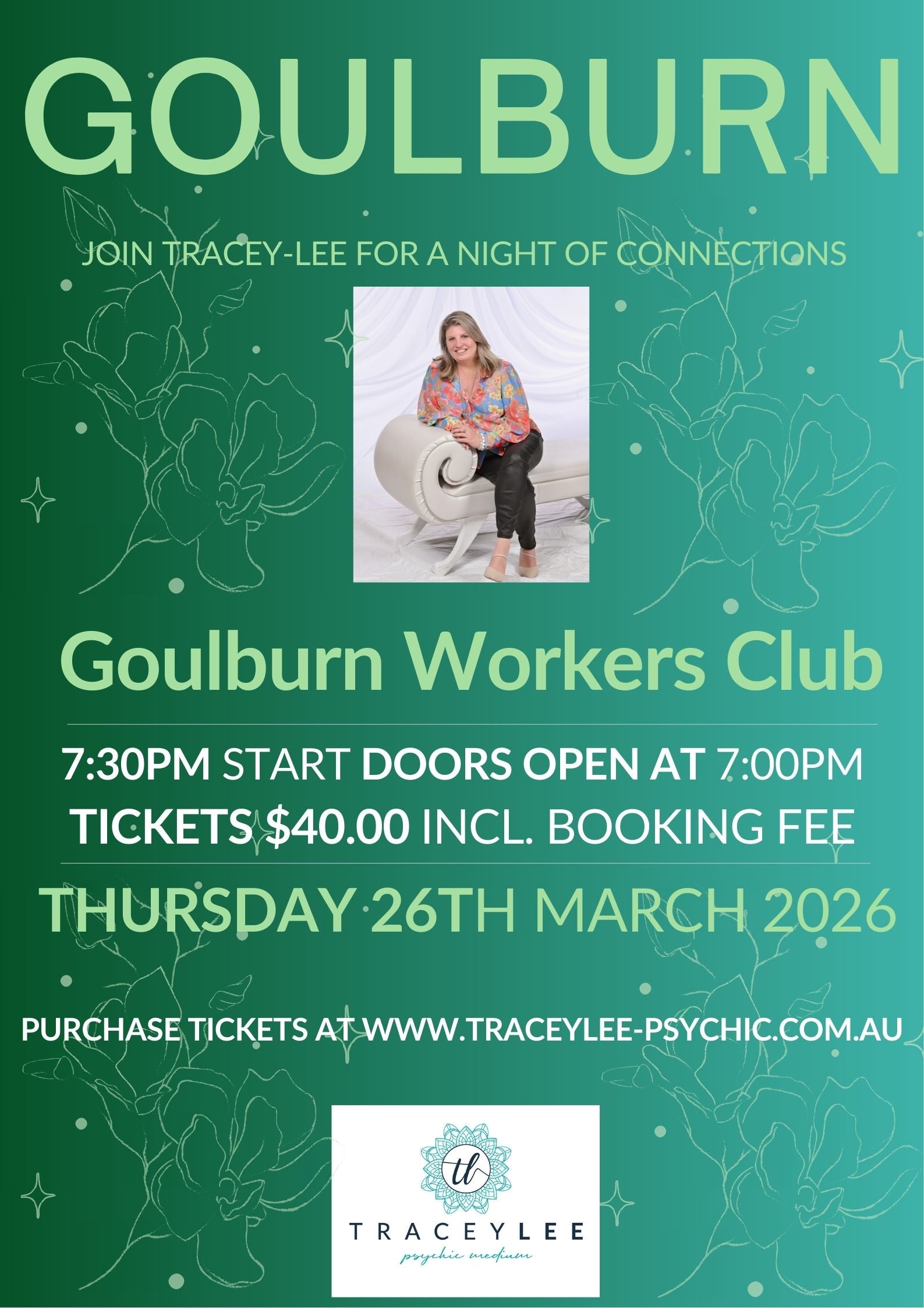 Join us for a night of connections, revelations, and powerful messages from beyond as renowned psychic medium Tracey-Lee takes the stage! With years of experience and an incredible gift for connecting with the spirit world, Tracey-Lee will deliver heartfelt messages, uncanny insights, and uplifting connections that will leave you amazed.
